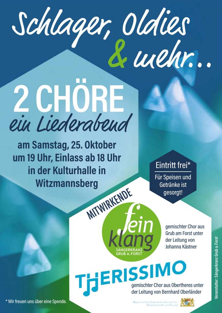 "Feinklang" ein gemischter Chor aus Grub am Forst und "Therissimo" – ein gemischter Chor aus Obertheres laden herzlich zu einem Liederabend mit Schlager, Oldies und vielem mehr ein.