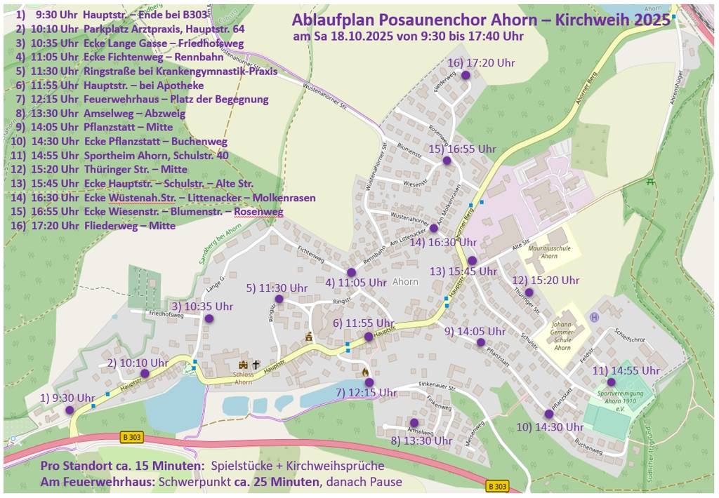 Der Chor wird an verschiedenen festen Plätzen zu bestimmten Uhrzeiten seine Ständchen für ca. 15 Minuten zu Gehör bringen. Als Kirchweihpfarrer begleitet den Posaunenchor Ingmar Reisenhofer, der die Kerwaspürche vorträgt. Einen Schwerpunkt wird es mittags um ca. 12:15 Uhr beim Fest der Feuerwehr auf dem Platz der Begegnung geben.