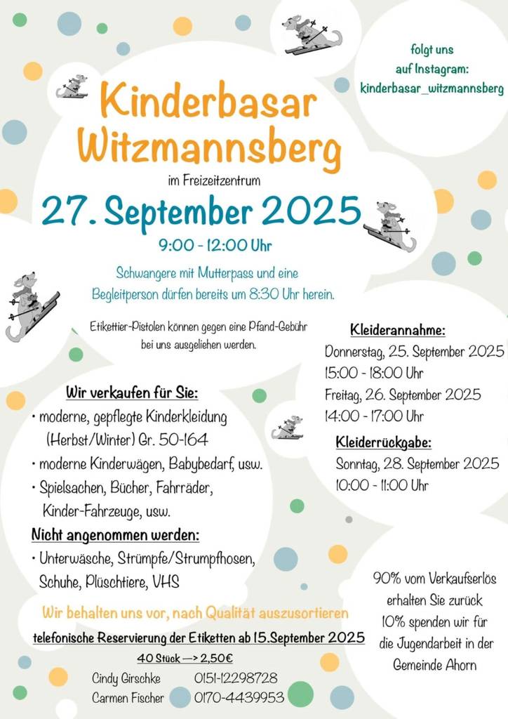 Am kommenden Wochenende findet der traditionelle Kinderbasar in der Kulturhalle in Witzmannsberg statt. Verkauft werden moderne, gepflegte Kinderkleidung (Herbst/Winter) von Gr. 50 bis 164, Kinderwägen, Babybedarf, Spielsachen, Bücher, Fahrräder und vieles mehr.