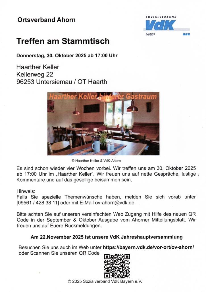 Herzliche Einladung zum kommenden VdK Ortsverband Ahorn Stammtisch