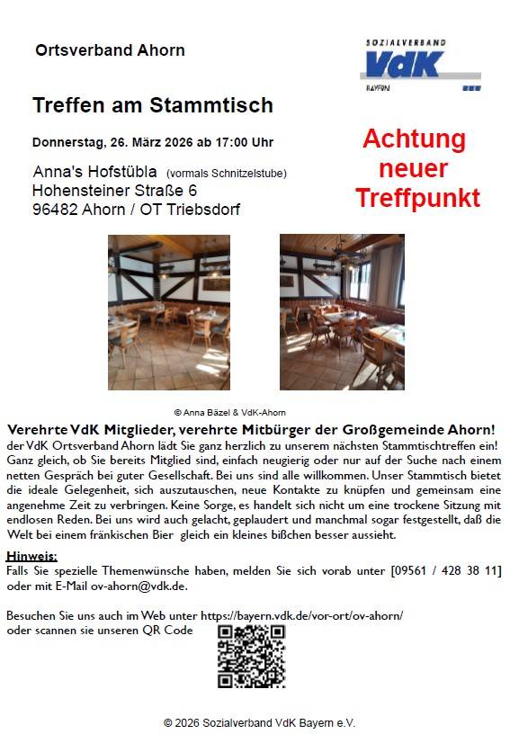 Herzliche Einladung des VdK Ortsverband Ahorn zum kommenden Stammtisch. Alle Bürgerinnen und Bürger sind herzlich eingeladen, die neusten Ereignisse zu diskutieren.