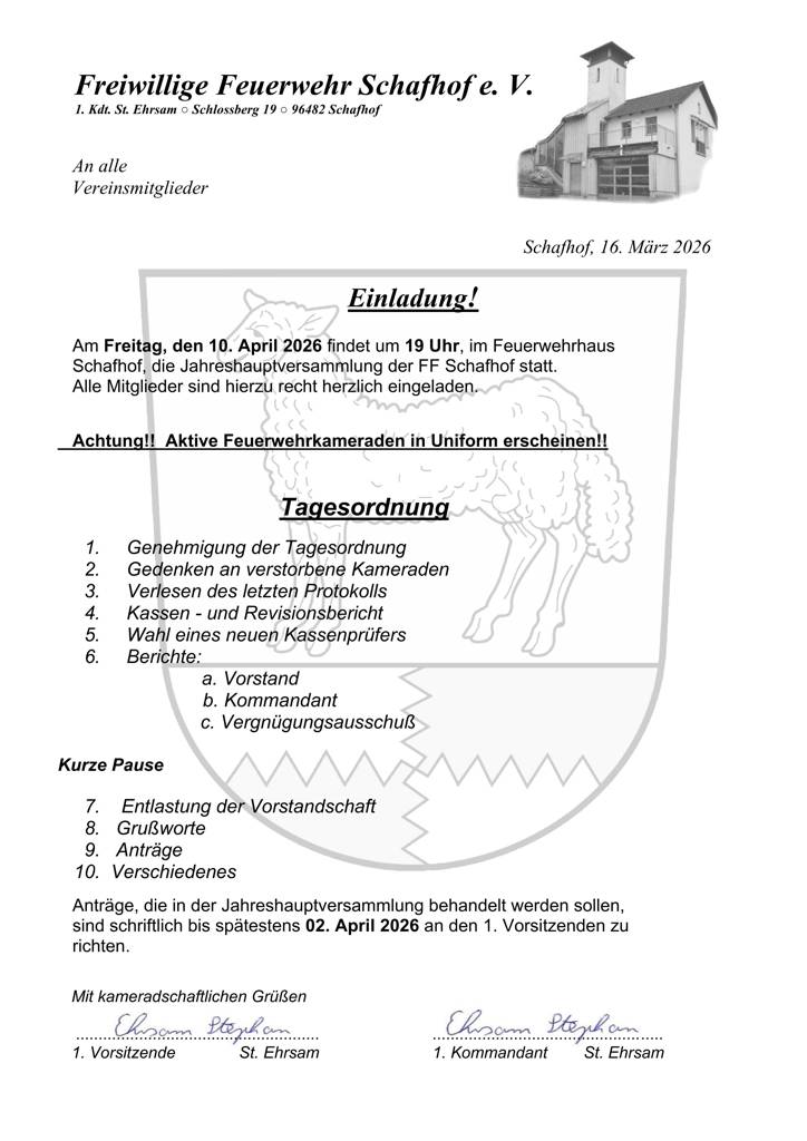 Herzliche Einladung zur Jahreshauptversammlung der Freiwilligen Feuerwehr Schafhof.