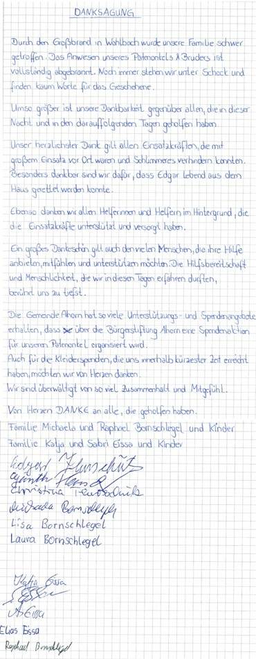 Der Zusammenhalt in unserer Gemeinde zeigt sich besonders in schwierigen Zeiten. Die betroffene Familie des Brandes in Ahorn hat ihre Dankbarkeit in einem persönlichen Brief festgehalten, den wir – mit ihrem Einverständnis – gerne an Sie weitergeben (siehe Bild).