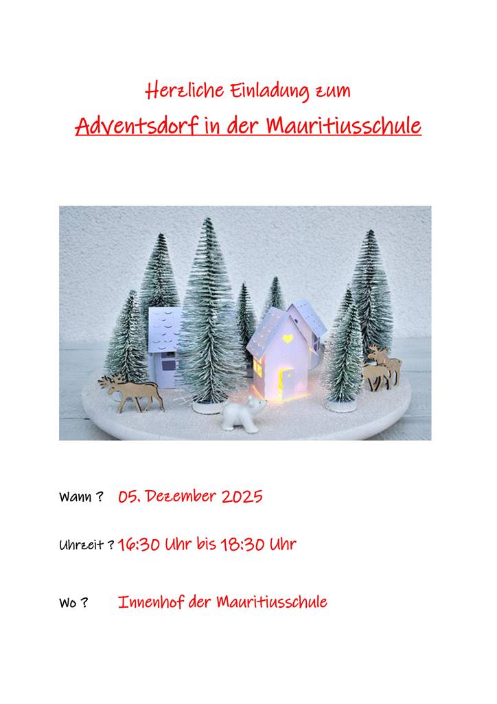 Am Freitag, den 5. Dezember 2025, lädt die Mauritiusschule Ahorn zu ihrem Adventsnachmittag ein. Von 16:30 Uhr bis 18:30 Uhr öffnet das stimmungsvoll geschmückte Adventsdorf im Innenhof der Schule auch für interessierte Bürgerinnen und Bürger seine Tore.