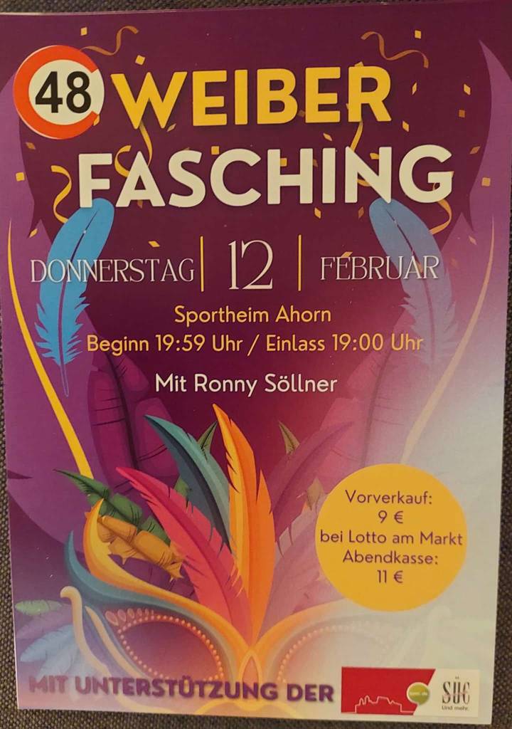 Herzliche Einladung zum Weiberfasching in Ahorn. In der Vereinsturnhalle der Spvg Ahorn werden wie immer nur die Frauen das Zepter in der Hand haben – mit Ausnahme von Ronny Söllner dem altbewährten Musiker.