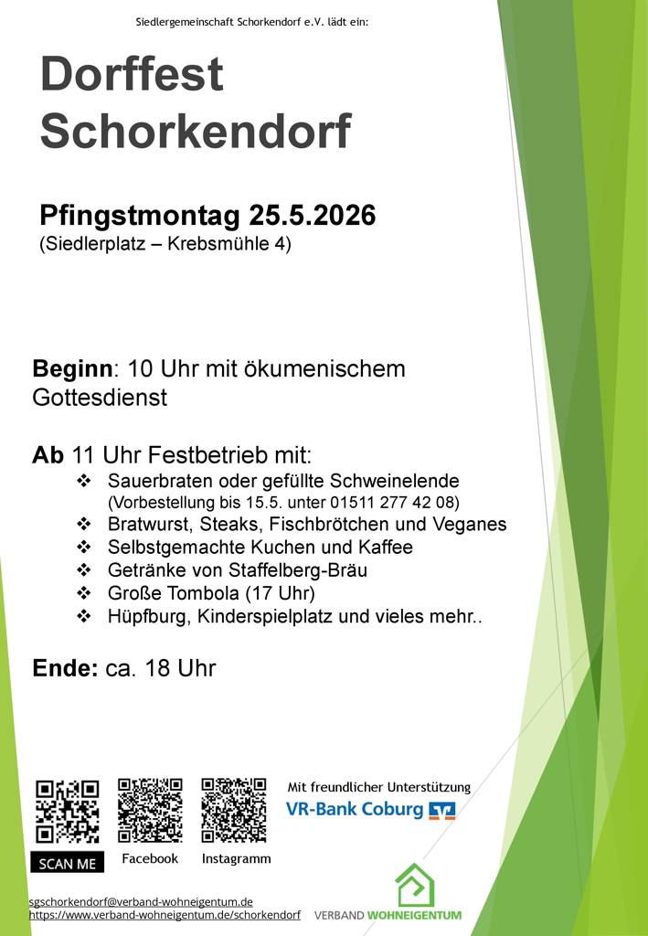 Herzliche Einladung der Siedlergemeinschaft Schorkendorf e.V. zum Dorffest am Pfingstmontag