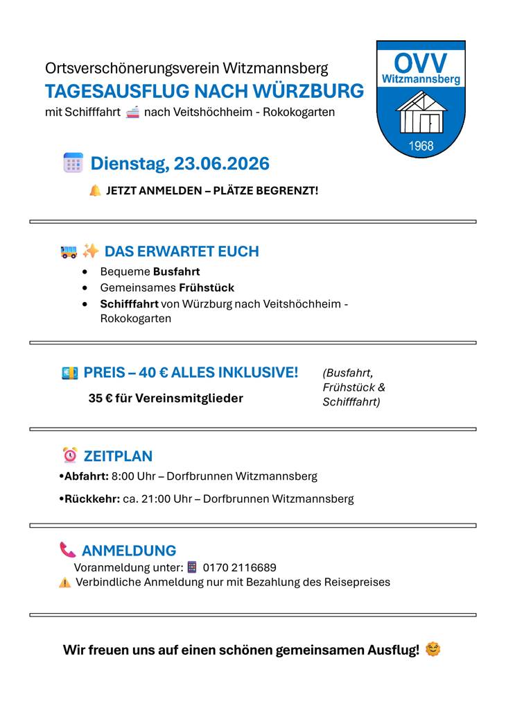 Der Ortsverschönerungsverein Witzmannsberg lädt herzlich zu einem Tagesausflug nach Würzburg mit Schifffahrt nach Veitshöchheim - Rokokogarten ein.