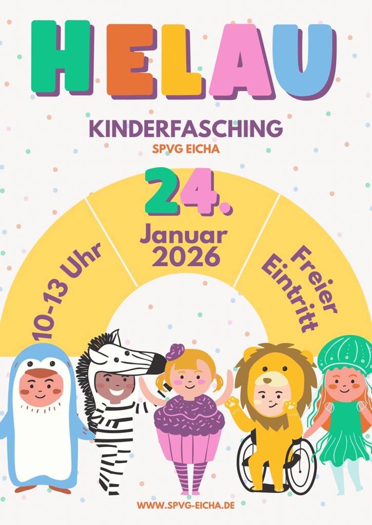 Helau und Alaaf - die Spvg Eicha lädt alle kleinen Närrinnen und Narren herzlich zum Kinderfasching ein. Freut euch auf einen fröhlichen Vormittag mit Spiel, Spaß, Musik und tollen Kostümen!