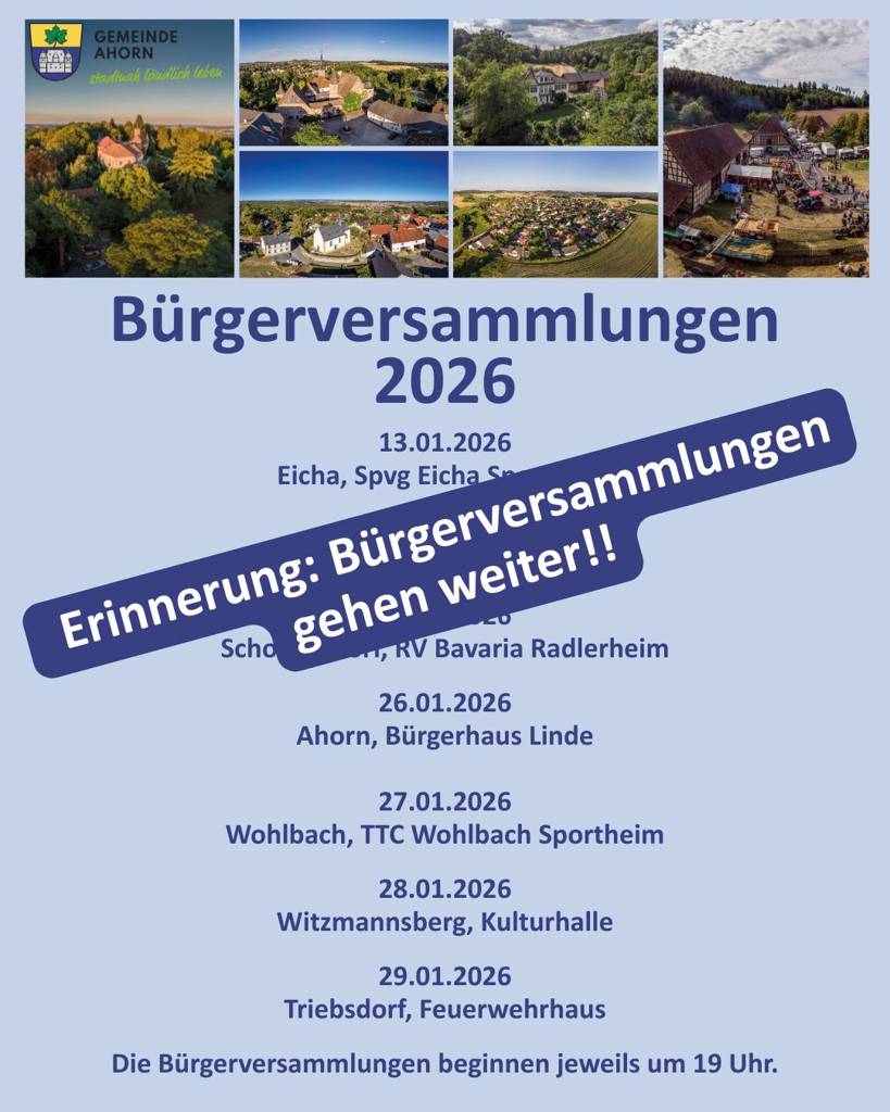 Die Gemeindeverwaltung Ahorn lädt alle Bürgerinnen und Bürger herzlich zu den Bürgerversammlungen 2026 ein.