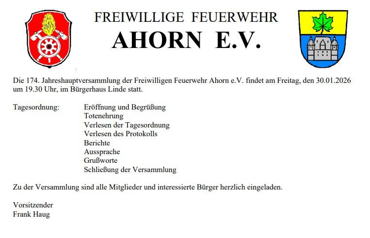 Herzliche Einladung an alle Vereinsmitglieder und interessierten Bürger zur Jahreshauptversammlung der Freiwilligen Feuerwehr Ahorn e.V.