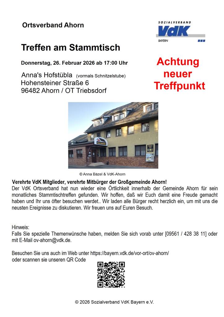 Herzliche Einladung des VdK Ortsverband Ahorn zum kommenden Stammtisch. Alle Bürgerinnen und Bürger sind herzlich eingeladen, die neusten Ereignisse zu diskutieren.