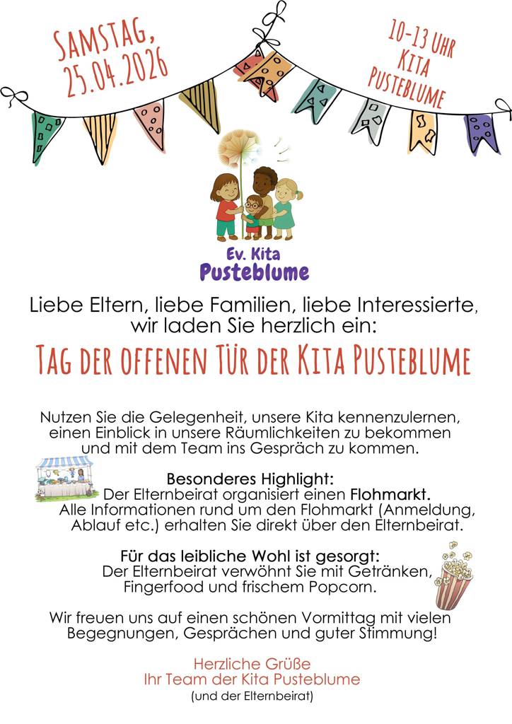 Nutzen Sie die Gelegenheit, die Kita Pusteblume kennenzulernen, einen Einblick in die Räumlichkeiten zu beko0mnmen und mit dem Team ins Gespräch zu kommen.