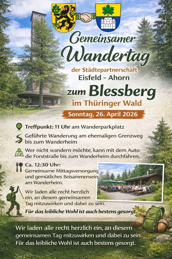 Am Sonntag, den 26. April 2026, startet die Veranstaltung um 11:00 Uhr mit einer geführten Wanderung entlang des ehemaligen Grenzwegs bis zum Wanderheim auf dem Bleßberg. Alternativ können Sie das Ziel auch bequem mit dem Auto über die Forststraße erreichen. Ab etwa 12:30 Uhr erwartet Sie eine gemeinsame Mittagsverpflegung sowie ein gemütliches Beisammensein. Für das leibliche Wohl ist bestens gesorgt.