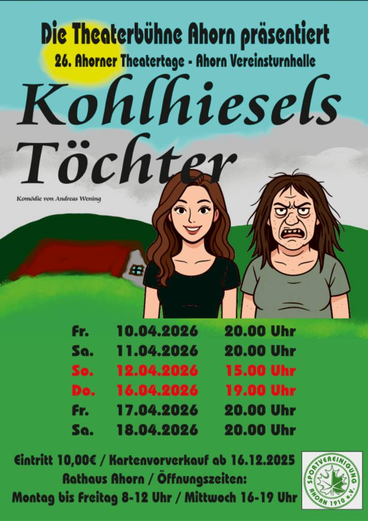 Die Theaterbühne Ahorn präsentiert die 26. Ahorner Theatertage in der Vereinsturnhalle Ahorn.